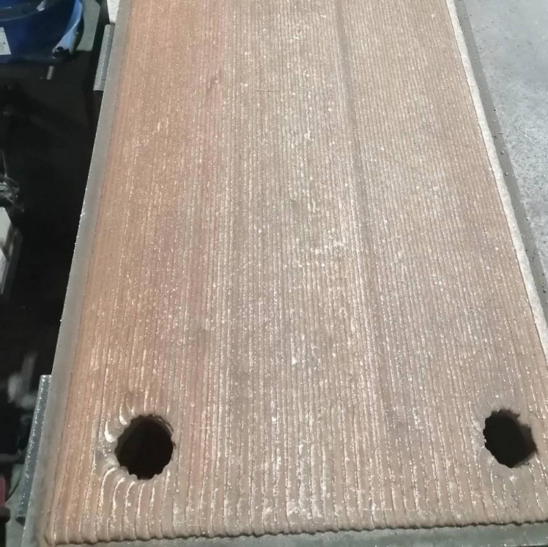 Despite the existing limitations, we have developed on RTC a complex technology of surfacing a reinforcing layer of metal sheet. There were some restrictions on the weight of the product, it was necessary to focus on the equipment, because the load on the axis of the manipulator should not exceed the norm. Therefore, we used aluminum components in the equipment, to facilitate the design of the tabletop designed and manufactured aluminum beams of a special shape, trying to maintain the rigidity of the structure while relieving its weight. Also special attention was required to uniform clamping and equal retention of sheets at surfacing. We managed to design and make such equipment designs that became both light and did not lose rigidity. Special software has also been installed, which we use for additive technologies for growing metal by 3D printing.